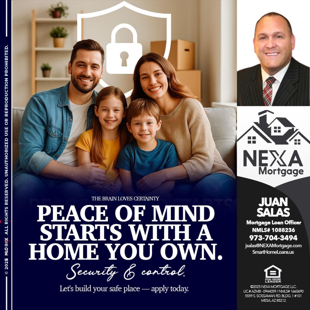 PEACE OF MIND - Juan Salas -Sr. Mortgage Loan OfficerHi, my name is Juan Salas. I’m a Loan Officer with NEXA Mortgage LLC., offering personalized mortgage solutions, fast customized quotes, great rates and service with integrity.